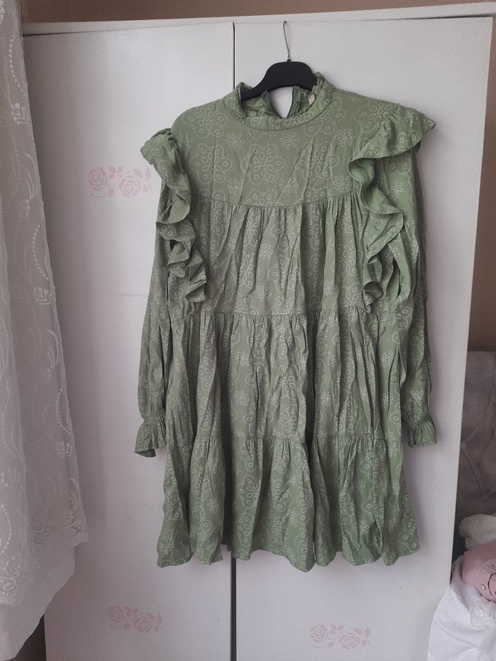 kumaşı çok güzel pamuk ve sanki hafif ipek karışımı fıstık yeşili rengi fotograftakinden biraz daha açık renk ürünü çok temiz kullandim boyu 85 cm 90 cm 42 bedene olur