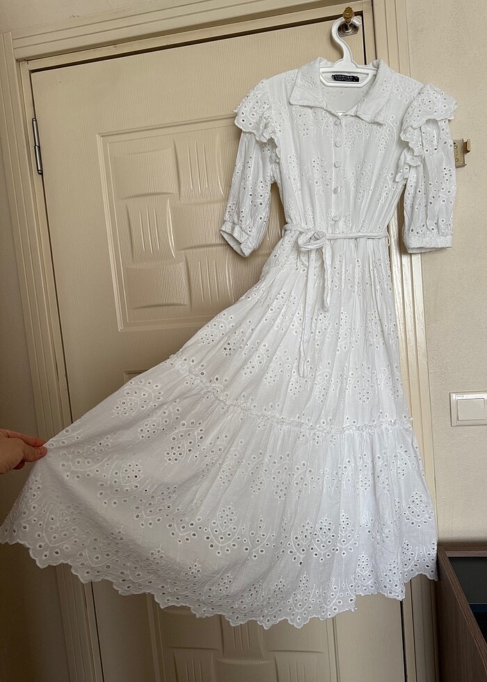 S beden fisto beyaz elbise içi astarlı beli lastikli ve kuşaklı . kızımın doğum gününde gitmek için almıştım hiçbir defo leke yoktur Boyu omuzdan 112 cm dir .Günlük ve özel gün kullanımına uygundur Nikahta bile giyilebilir şık ve spor kombin yapılabilir