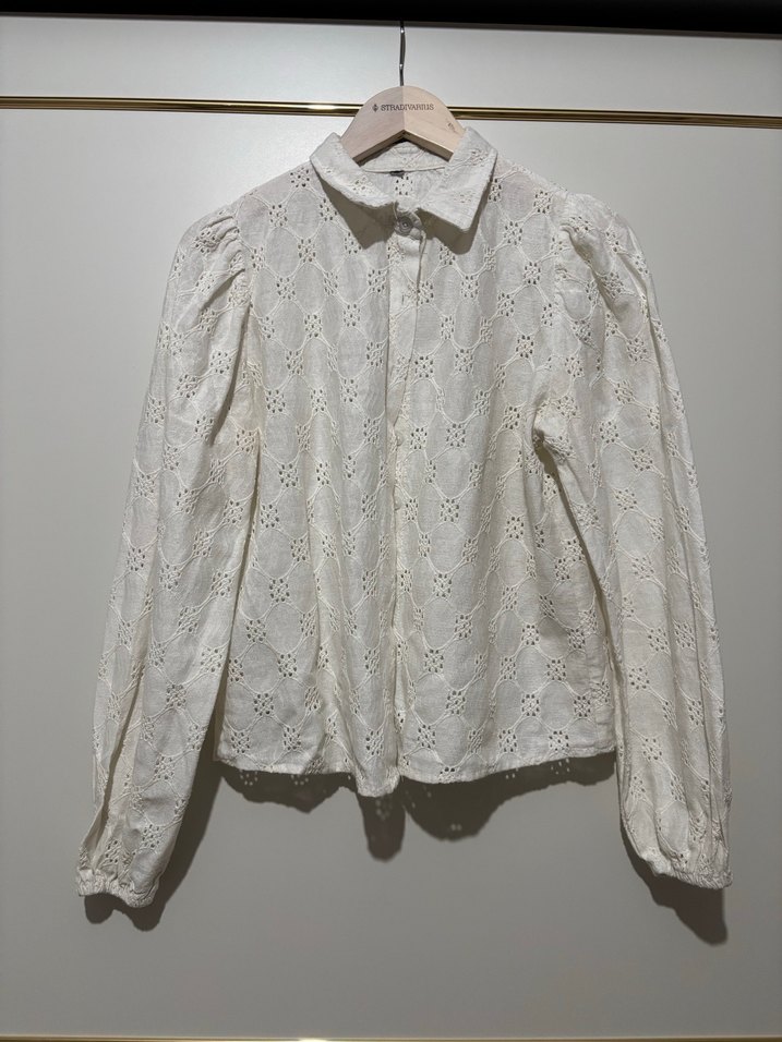 Uzun kollu, yakalı ve nakışlı dantel detaylı beyaz keten gömlek. Bol kesim ve bohem tarzıyla ofis için uygundur. Bir kere giyildi