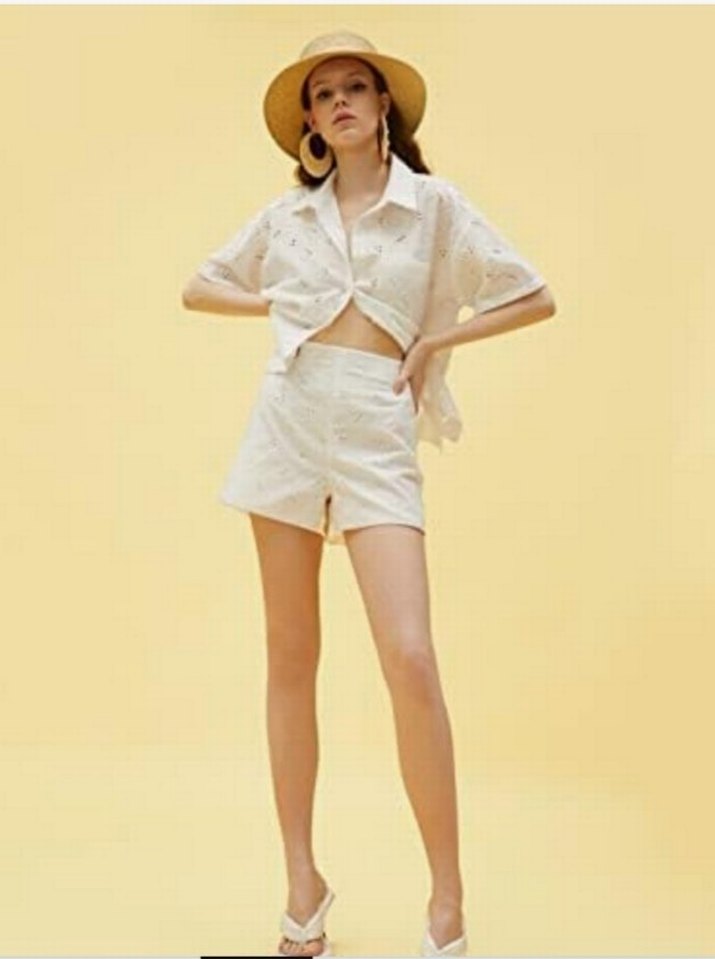 Pamuklu, beyaz renkte, bol kesim mini şort. Rahat ve şık görünüm sunar, günlük kullanıma uygundur.