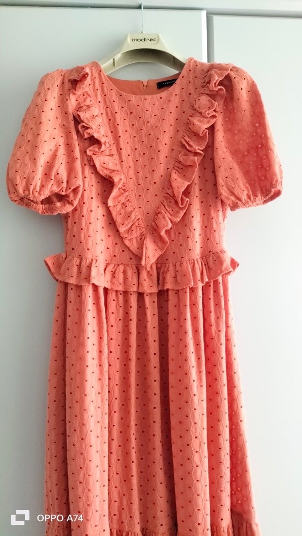 Pastel pembe renkte, ön ve bel kısmında fırfırlar bulunan, kısa balon kollu, yuvarlak yakalı ve bol kesim bohem tarzda puantiyeli elbise. s beden sorunsuz astarlı