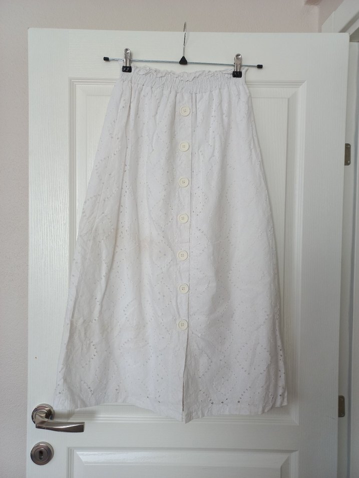 fistolu etek. kumaştan kaynaklı lekeler var biri sağ diz kısmında biri sol etek ucunda sarımtrak leke var. 36 bedene uygun içinde polyester kumaştan astarı var Bel 31 cm Boy 85 cm