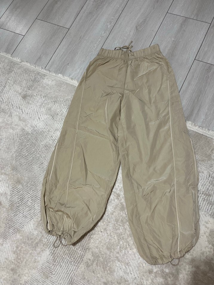 Bej renk, paraşüt kumaştan, bol kesim midi uzunluğunda, lastikli paçalı kadın pantolon. Rahat ve şık dış mekan kullanımı için uygundur.