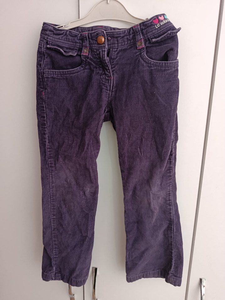 Mor renkte, düğmeli ön kısmı ve bol kesimiyle kız çocukları için pantolon. Desensiz, normcore tarzda rahat bir model. düğme değişimi yapılmıştır görselde görülmektedir