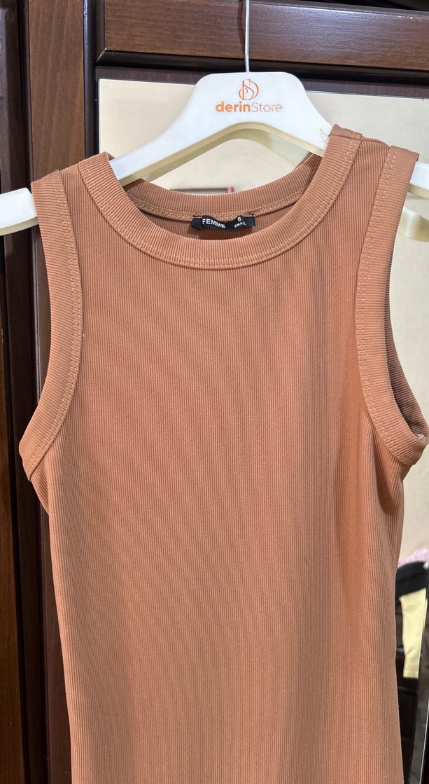 Sıfır kol fitilli camel renginde midi boy elbisem