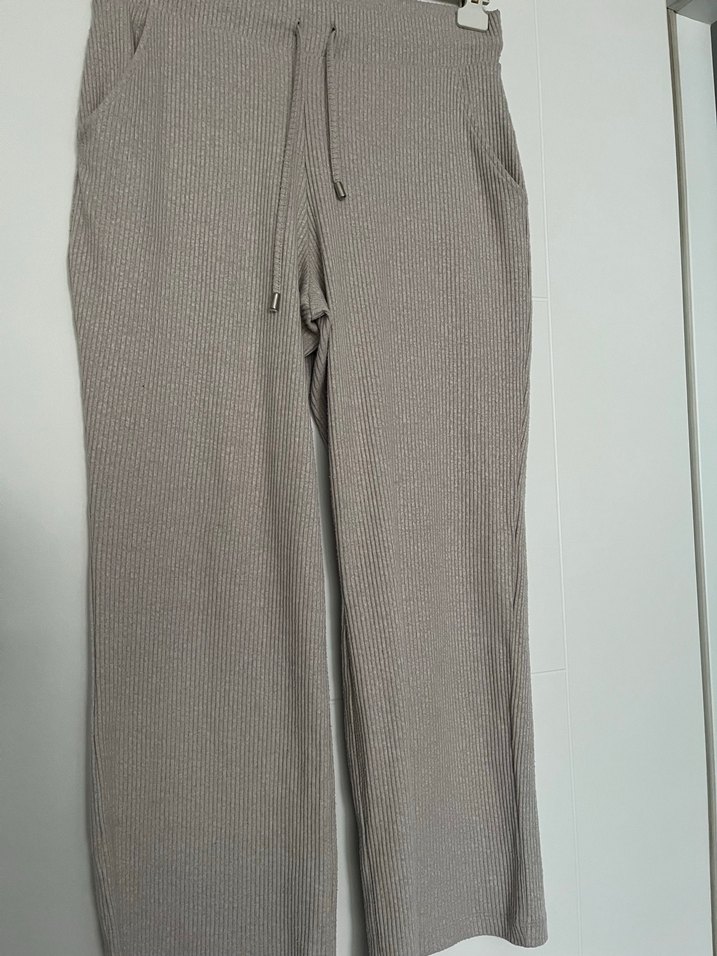 Bej keten kumaştan, bol kesim ve midi boy kadın pantolon. Günlük kullanıma uygun, desen içermeyen rahat ve şık tasarım.