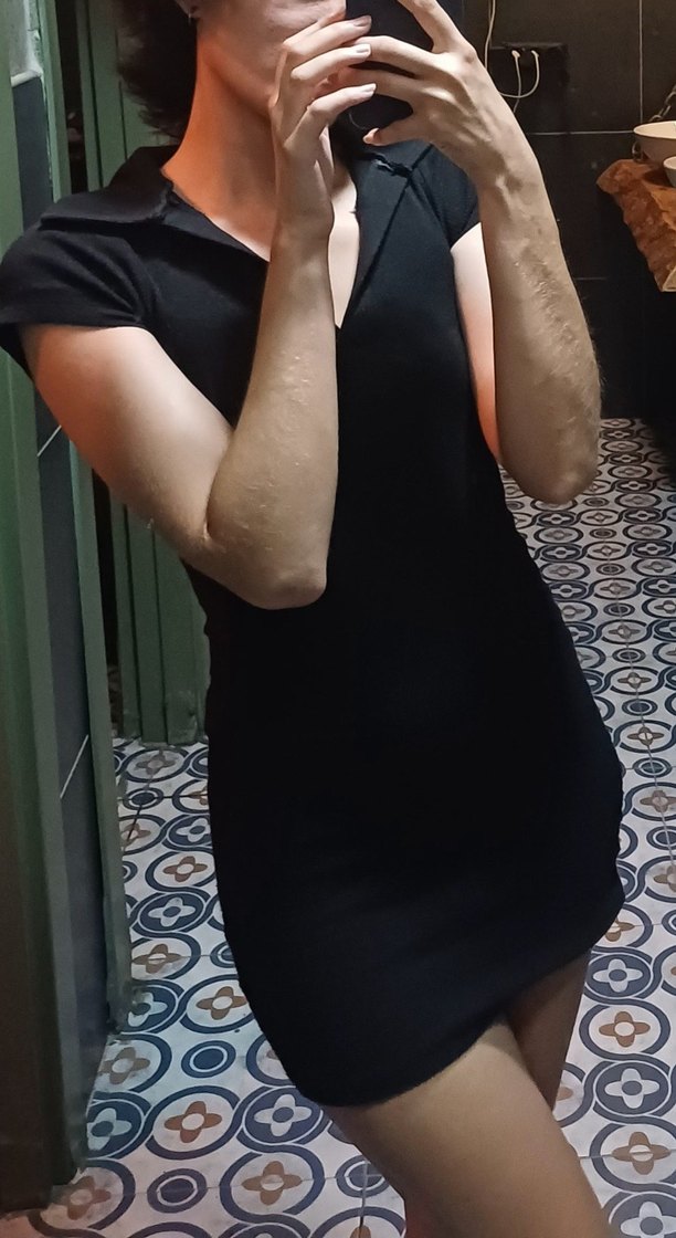 fitilli, kısa kollu ve yakalı siyah midi elbise, yumuşak fitilli sentetik kumaştan üretilmiştir. cok hafif solma vardır.