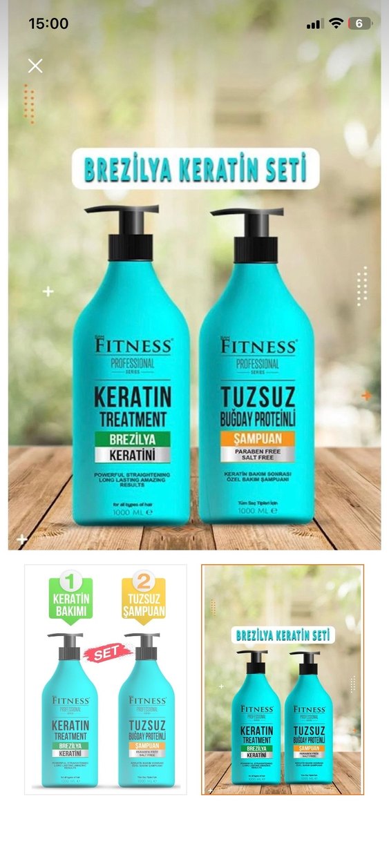 Fitness Profesyonel tuzsuz buğday proteinli şampuan ve Brezilya keratini içeren keratin bakım seti. Her şişe 1000 ml hacmindedir.