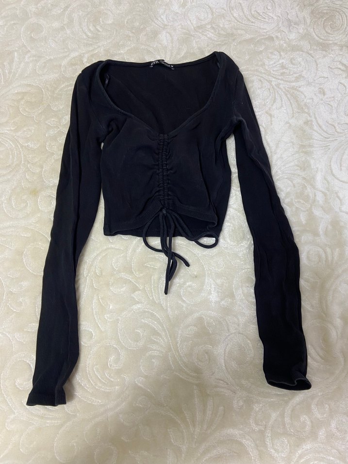 Fitted kesim siyah bluz, uzun kollu ve V yaka. Yumuşak ve sıcak kumaştan, önünde elastik detaylı, normal midi boyda,günlük kullanıma uygun.