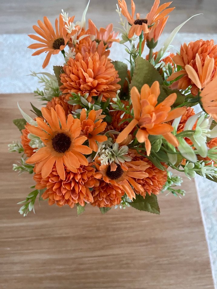 Canlı koyu turuncu yapay çiçekler ve yeşil yapraklardan oluşan dekoratif çiçek aranjmanı.