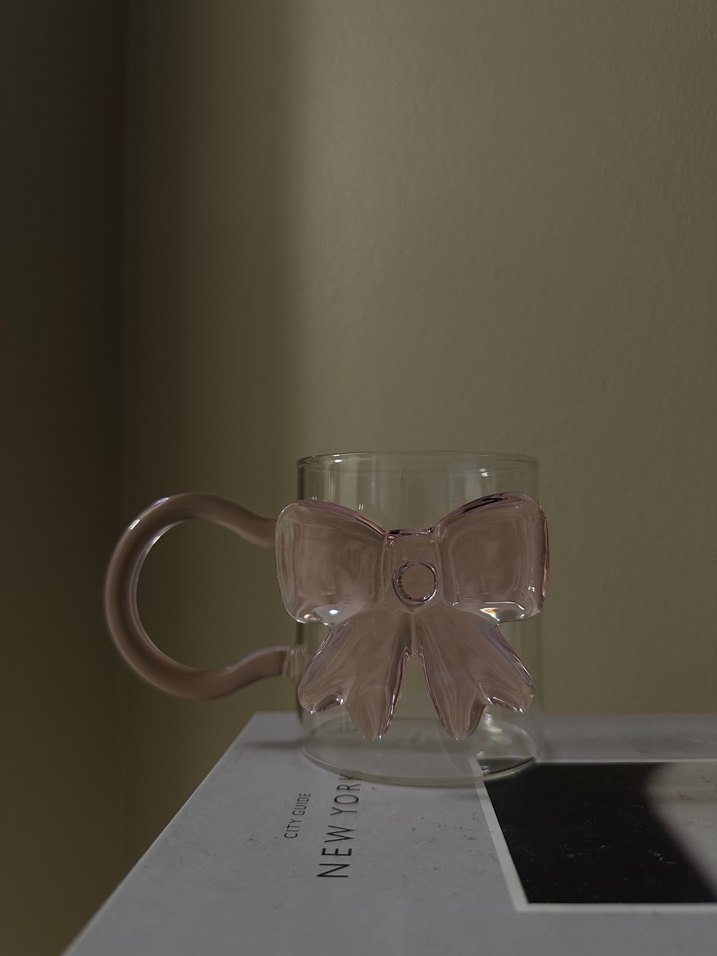 Pastel bej kulplu şeffaf cam kupa, önünde dekoratif fiyonk detayıyla sıcak içecekler için uygun. ☕