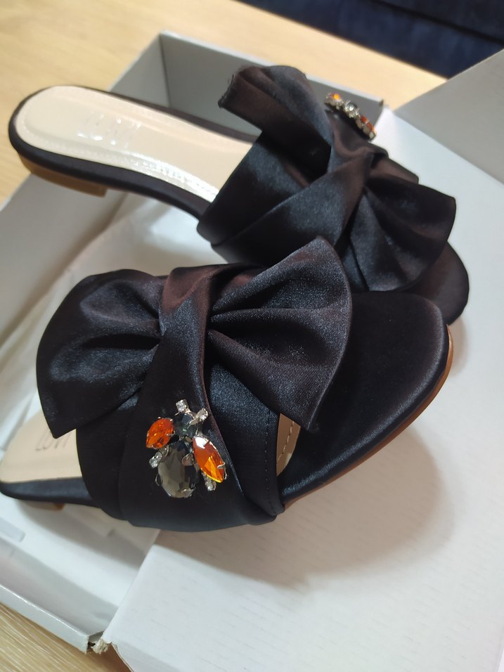 Siyah dolgu topuklu kadın terlik, nakışlı detaylar ve fiyonk süslemelidir. Kauçuk tabanlı, günlük kullanım için minimalist goth tarzında.