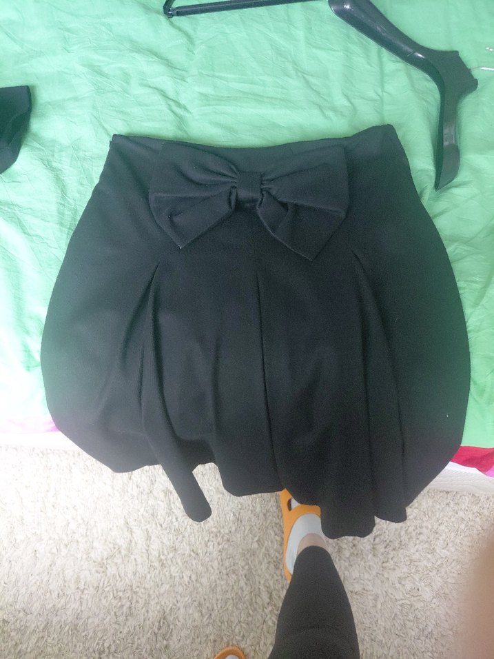 Belinde fiyonk detayı bulunan siyah, dar kesim mini etek. Pürüzsüz, gotik tarzda ve parti için uygun.