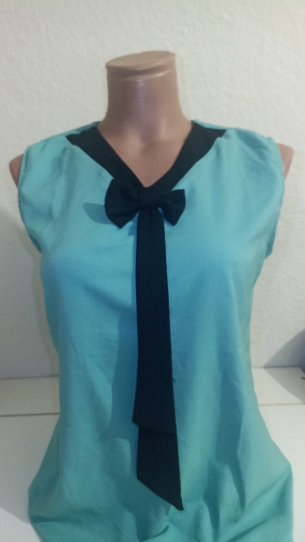 V yakalı, fiyonk detaylı turkuaz renkli, kolsuz bluz. Düz, sentetik kumaştan yapılmış, midi uzunlukta ve normal kesimlidir.