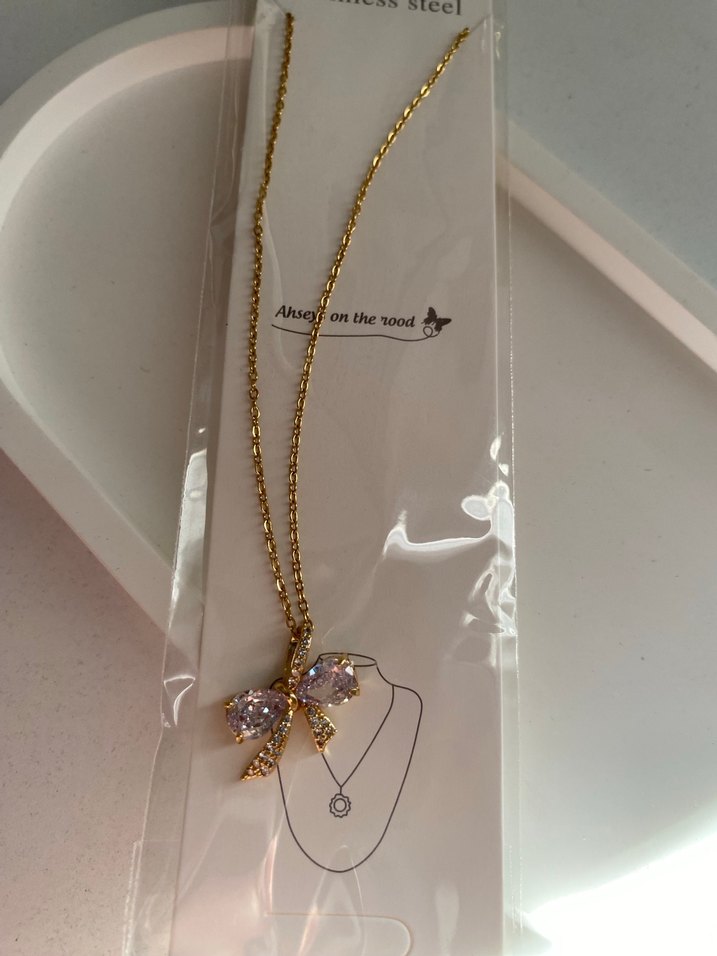 Altın renkli, zincir detaylı ve midi uzunlukta kolye. Üzerinde baskılı fiyonk figürü bulunur. Günlük kullanım için uygundur, sokak modası tarzında. ✨