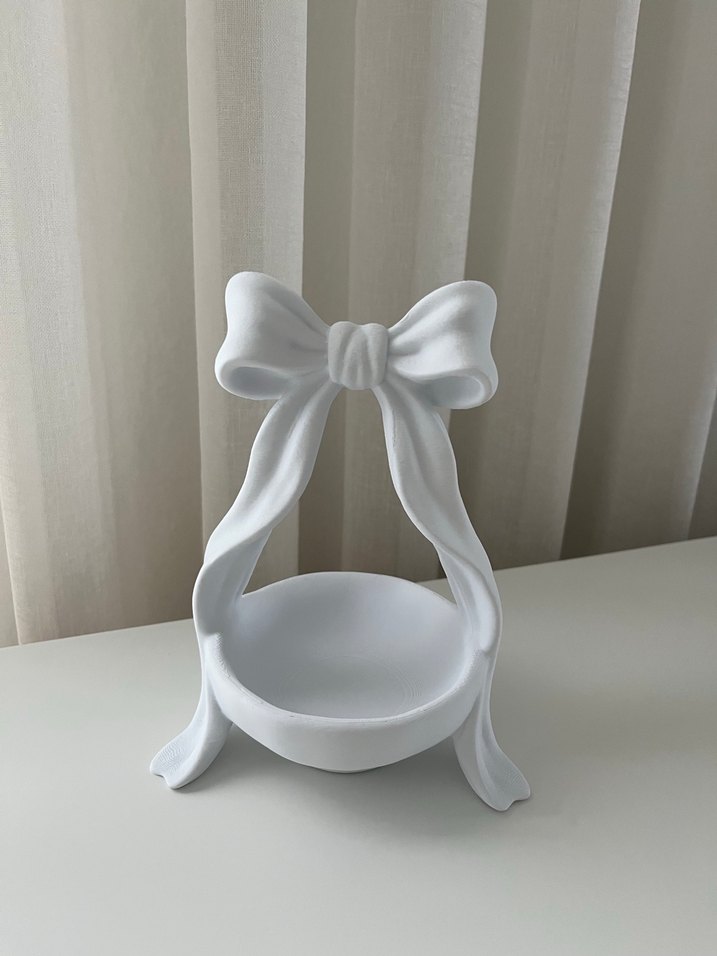 Dekoratif fiyonk detaylı beyaz sepet, küçük eşyalar için şık ve hafif tasarımda. 17.5x13.5cm