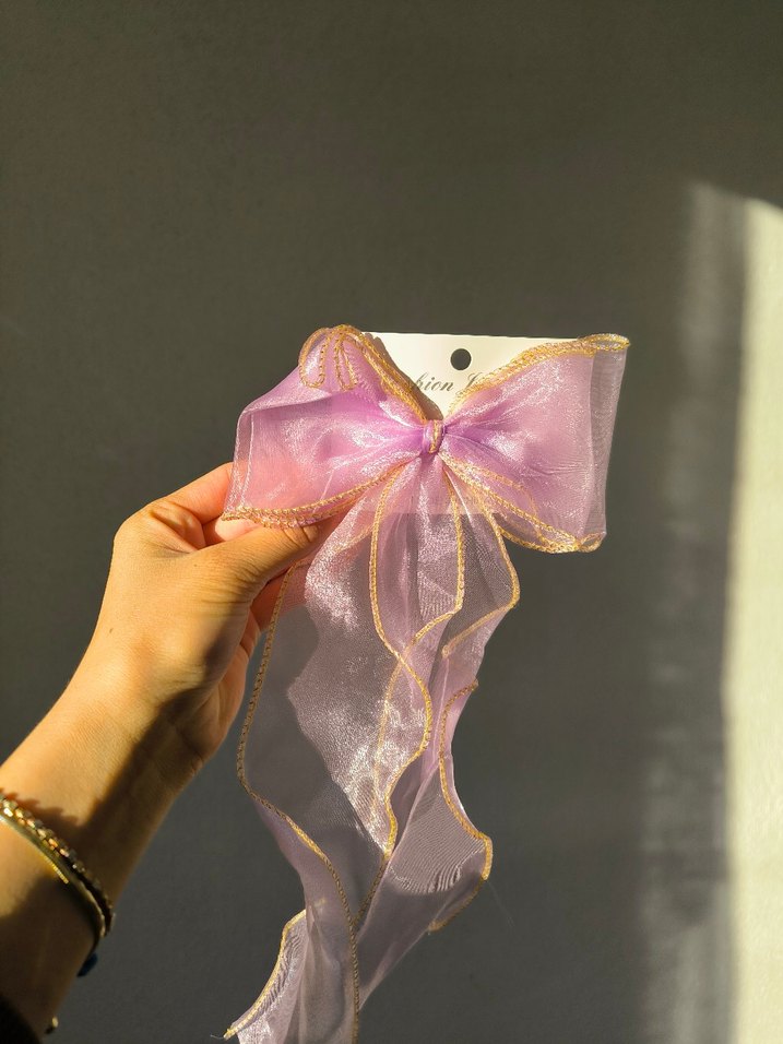 organze kurdele fiyonk toka astel pembe, ipek görünümlü, altın kenarlıklı bohem tarzda kurdele. Saçlarınıza şık ve avangart bir dokunuş katmak için ideal.