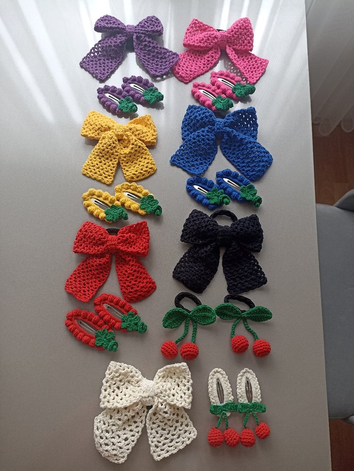 Renkli nakışlı çocuk saç bantları ve tokalar, fiyonk ve kiraz desenleriyle bohem tarzı için uygun.