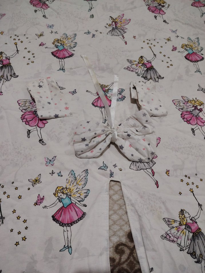 Beyaz baskılı, askılı kollu ve fiyonklu bebek puset örtüsü. #puset #pusetörtüsü #bebekarabasıörtüsü