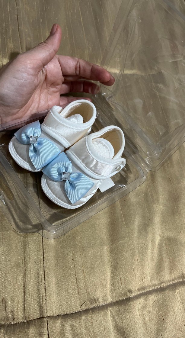 Pastel mavi fiyonklu ve nakış detaylı beyaz bebek ilk adım ayakkabısı, rahatlık sağlayan yumuşak kauçuk malzemeden üretilmiştir. Sokak stili için uygundur.