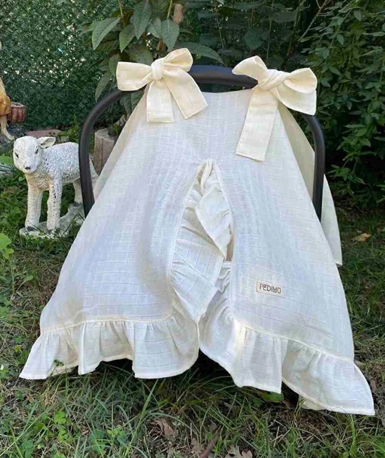 Yumuşak kumaş, dekoratif fiyonklar ve volanlı kenarlarla beyaz bebek örtüsü. Bebek koltuklarını örtmek için uygundur.