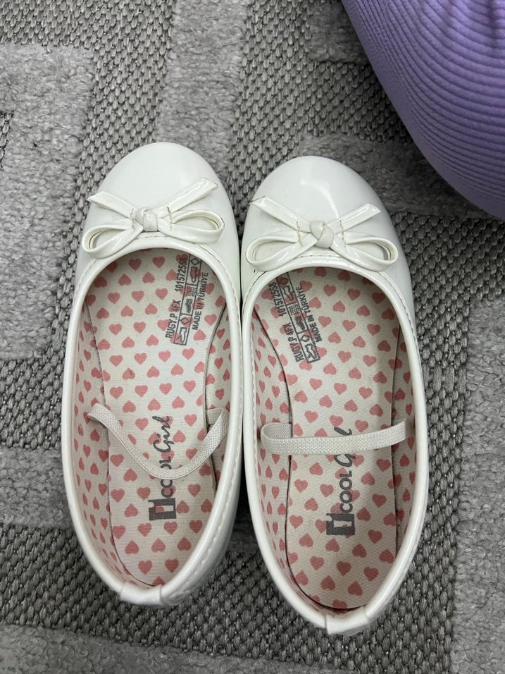 Beyaz renkli, fiyonklu kız babet ayakkabılar. Kauçuk malzemeden yapılmış, streetwear tarzında, iç kısmı kalp desenli. 23 Nisan törende bir defa kullanıldı