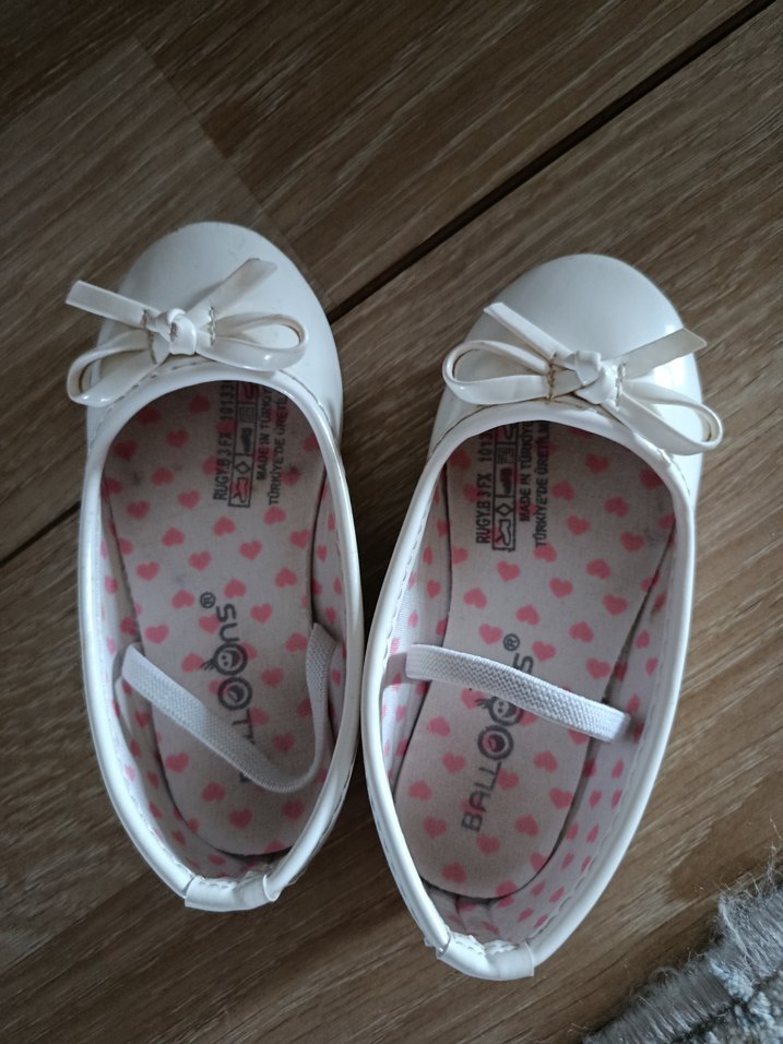 Fiyonklu beyaz kız çocuk babetleri, esnek kauçuk malzemeden üretilmiştir. İç kısmı kalp desenli yumuşak tabanlıdır.