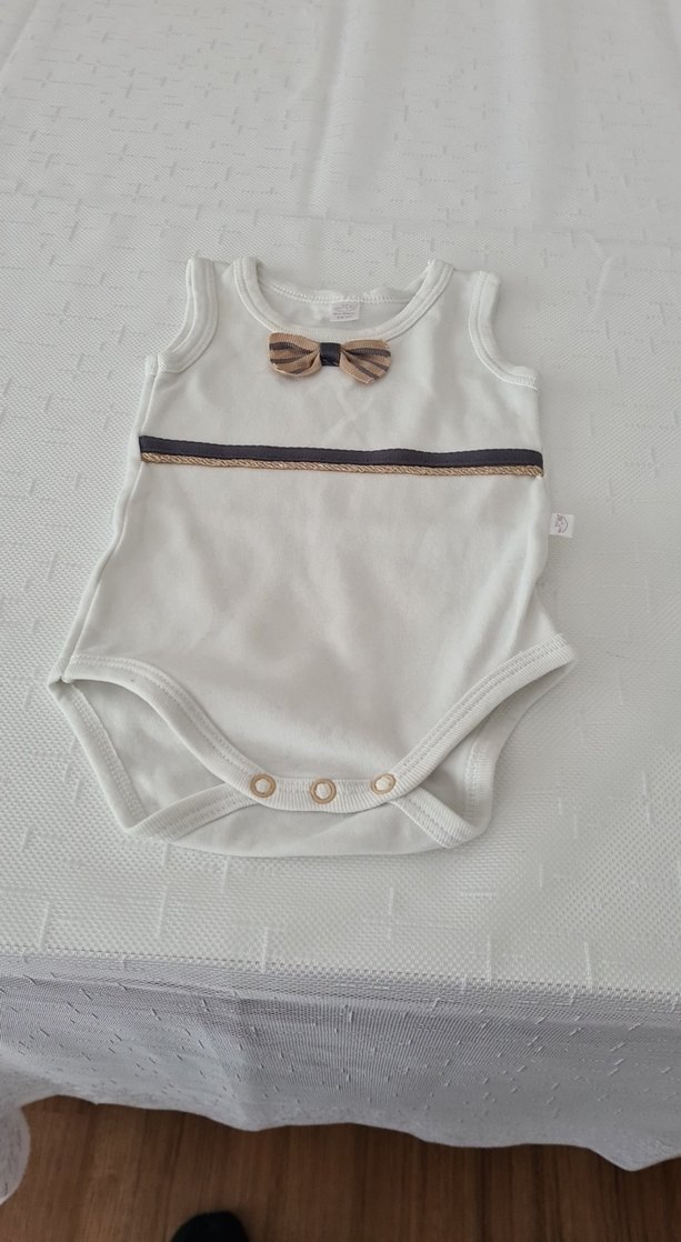 Kolsuz, yakalı beyaz bebek body, küçük fiyonk ve gri şerit detaylı. Alt kısmında çıtçıtlı, yumuşak kumaştan yapılmıştır.