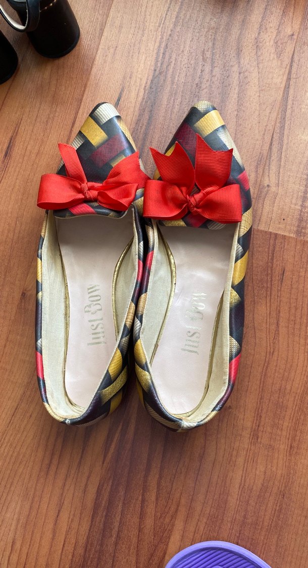 Çok renkli tie-dye desenli, kırmızı fiyonklu, blok topuklu kadın babet. Kauçuk malzemeden üretilmiştir ve romantik akşamlar için uygundur. Hiç sıkıntısı yok ihtiyacı olan alsın uygun fiyatlı
