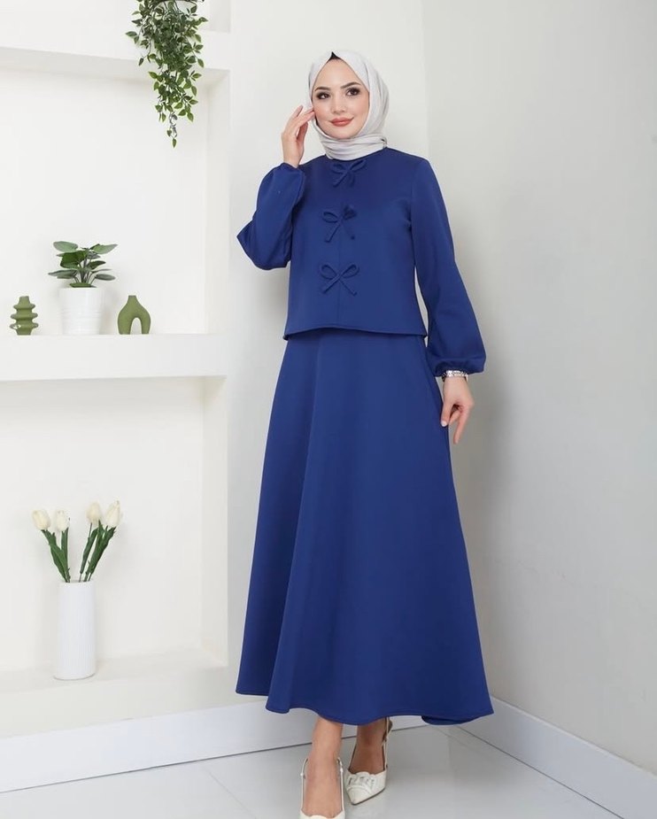 Fiyonklu Saks mavisi etekli takım rahat ve şık olup günlük ve özel günlerde kullanabilirsiniz