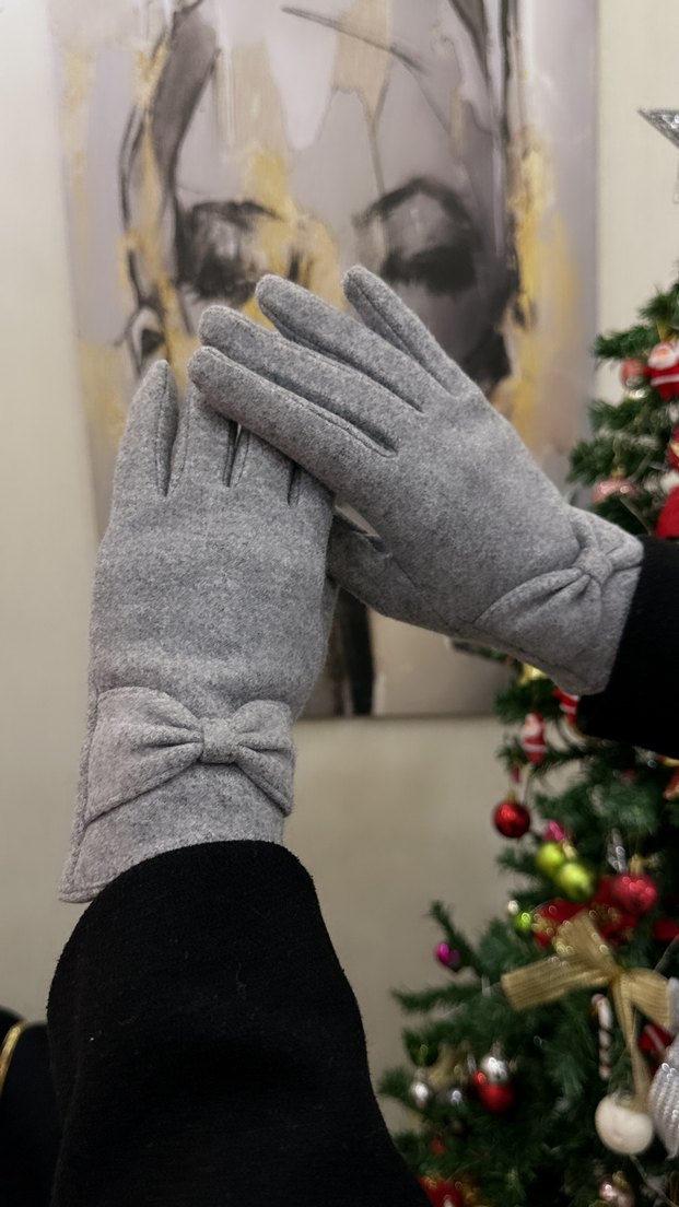 Yumuşak ve sıcak kumaştan, fiyonk detaylı gri kadın eldiveni, sokak stili için uygun.