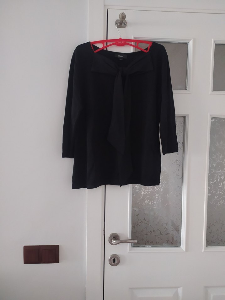 Dörtel Marka, siyah pamuklu kumaştan, Fransız kollu, Fiyonk yaka ofis için minimalist tarzda rahat kesim midi kadın bluz.