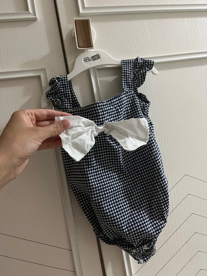 Gri kareli desene sahip bebek kız tulumunda beyaz fiyonk ve fırfırlı askılar bulunur. Bacak kısmı lastiklidir.