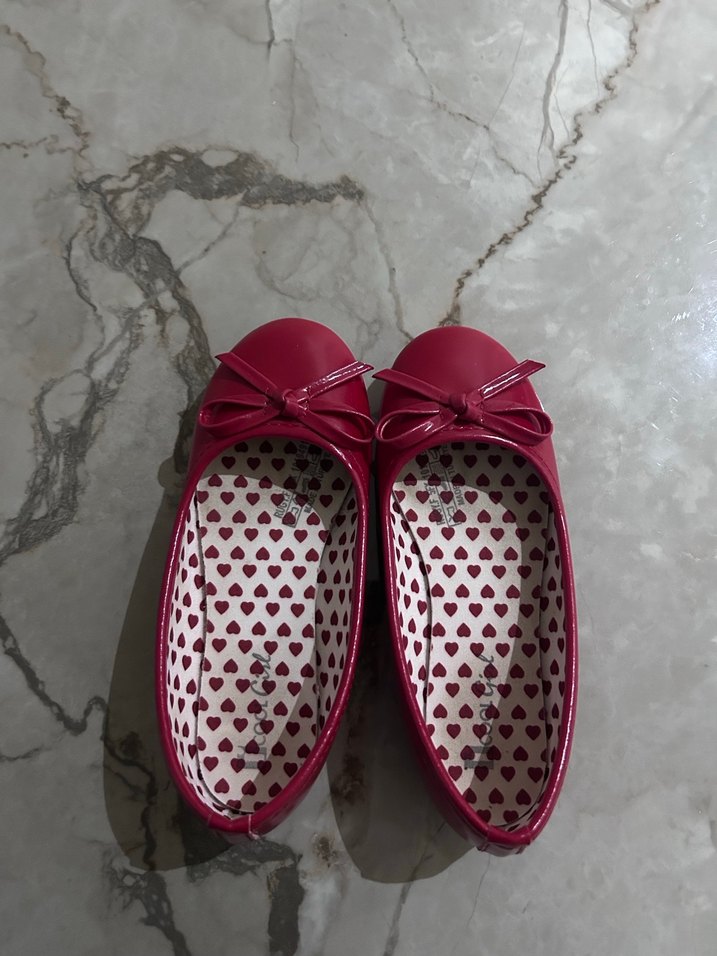 Fiyonklu ve kalp desenli iç tabanlı, kırmızı renkli kız çocuk babetleri, rahat ve şık bir görünüme sahiptir.