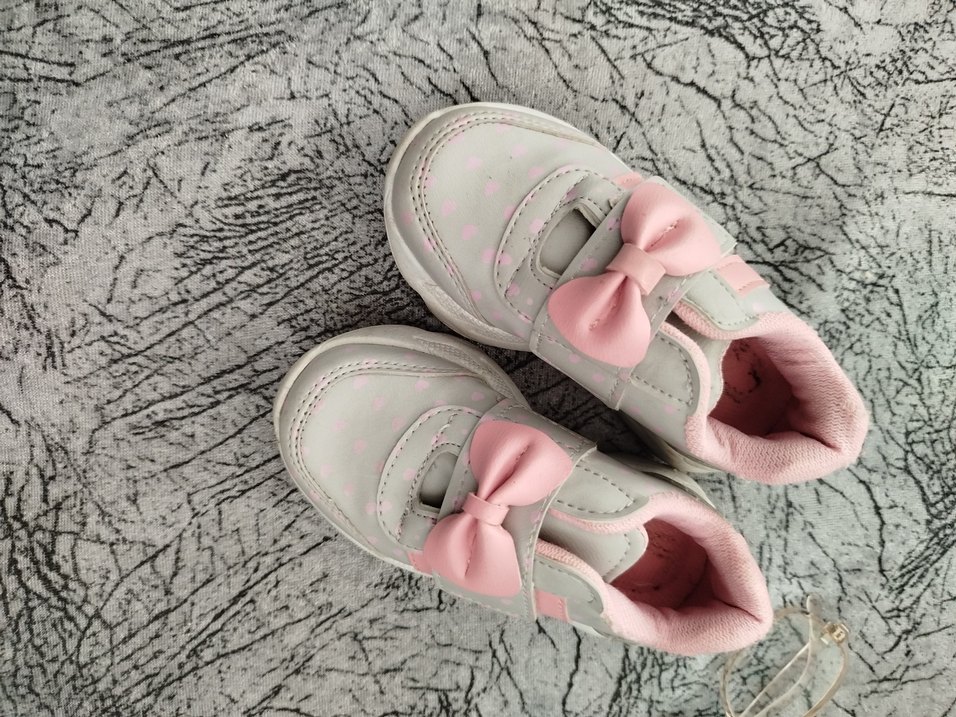 Kauçuk tabanlı kız çocuk spor ayakkabısı, pembe fiyonk detaylı ve hafif tie-dye gri desenli, trend sokak stili için uygun.