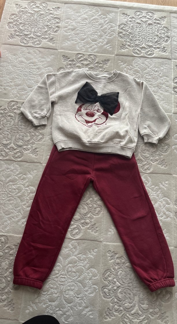 Orjinal zara Gri uzun kollu üstünde baskılı minnie yüz ve büyük siyah fiyonk bulunan, bordo pantolonlu kız çocuk takımı. Rahat ve şık.