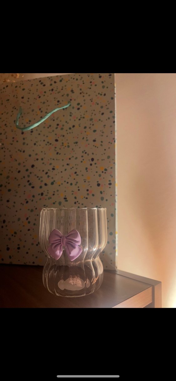 Pastel mor fiyonk detaylı, şeffaf cam bardak. Kabartmalı ve kıvrımlı tasarıma sahip, içecek sunumu için ideal.