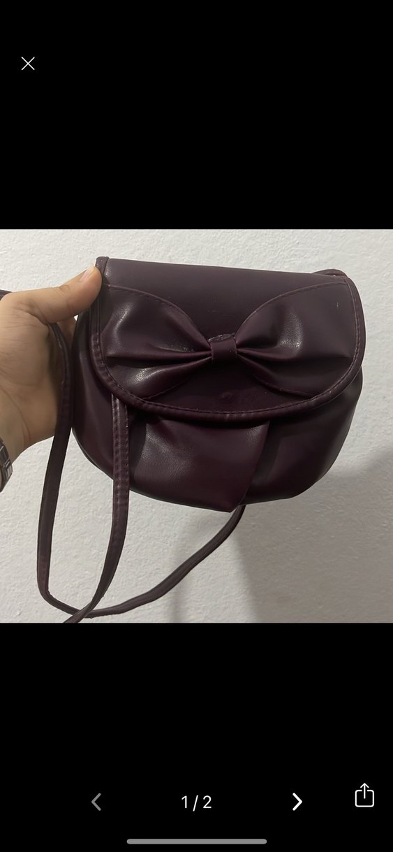 Koyu mor renkte, deri malzemeden yapılmış, fiyonklu kadın çantası. Minimalist ve gotik tarzda, günlük kullanıma uygun ve trend casual görünümlü. Teklif kabul ediyorum