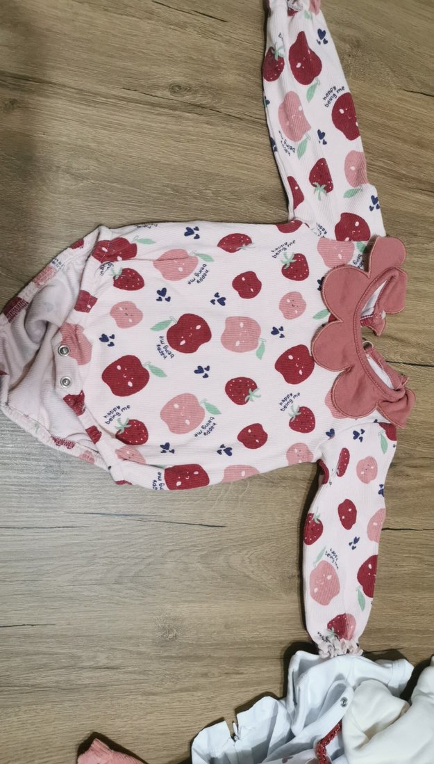 Pastel pembe zemin üzerine baskılı meyve deseni ve fiyonk detaylı bebek tulumu. Uzun kollu ve çıtçıtlı kapanışlıdır.