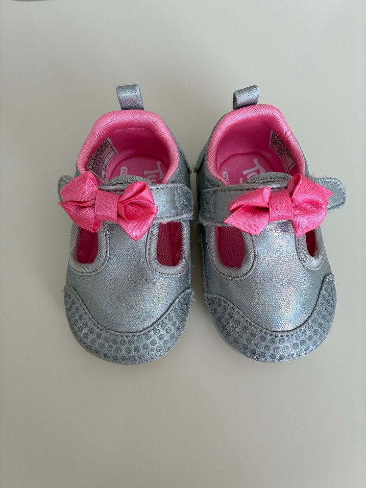 Gri kauçuk malzemeden, pembe fiyonk detaylı ve tie-dye desenli ilk adım ayakkabısı. Rahat ve sokak stili uyumlu.