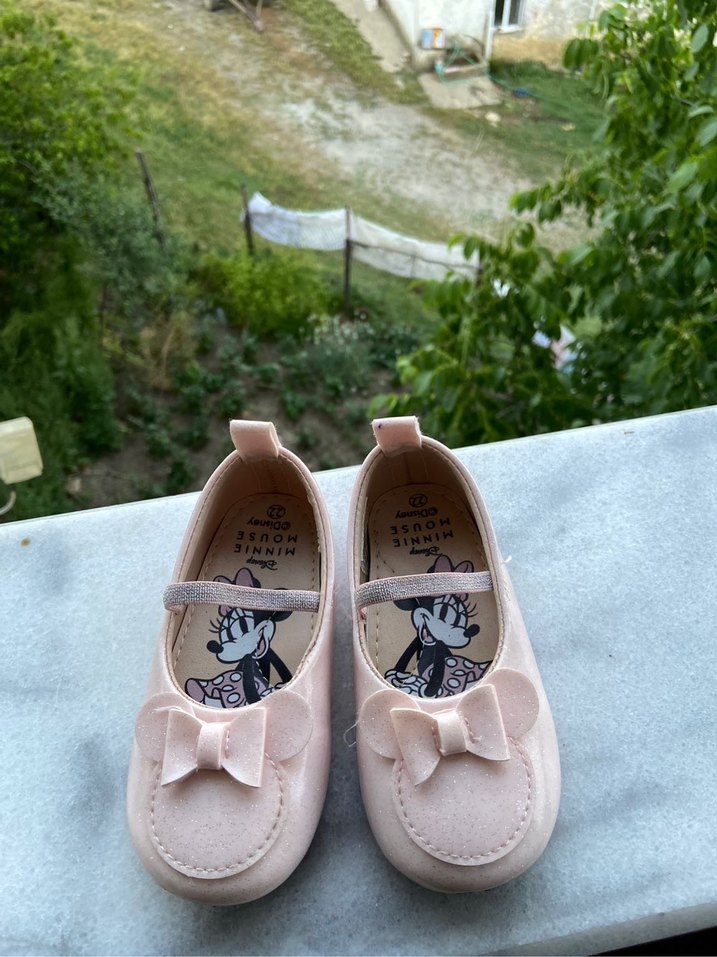 Pastel pembe renkli, fiyonklu kız babet ayakkabılar. İç tabanda baskılı desen ve rahat kauçuk malzeme kullanılmış.
