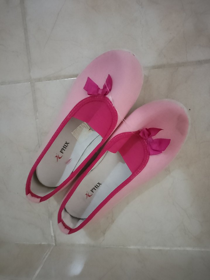 Pembe renkli, bağlama desenli ve fiyonk detaylı kız çocuk babet ayakkabısı, kauçuk malzemeden, bohem tarzda.