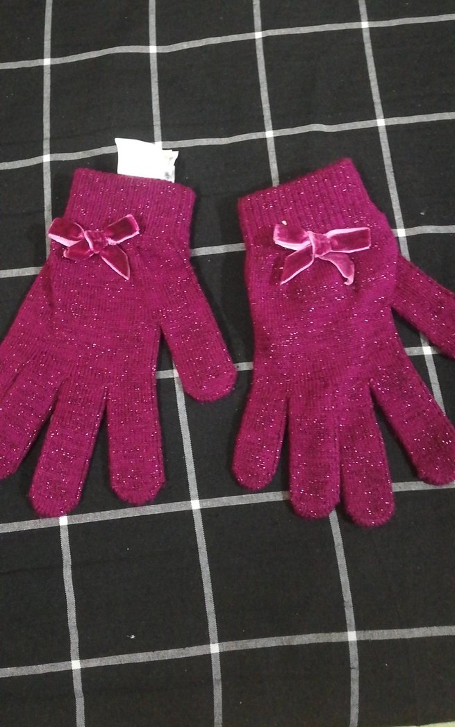 Pembe renkli, küçük fiyonk detaylı ve yumuşak dokulu kız eldivenleri, renkli bir görünüm sunar.