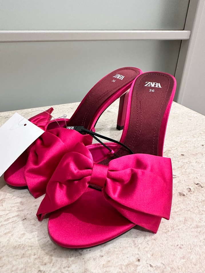 İpek gibi pembe yüksek topuklu stiletto, önünde büyük fiyonk detayıyla. Renkli ve desenli, ZABA markasına ait, çağdaş ve gösterişli bir tasarım. Romantik akşamlar için uygun.
