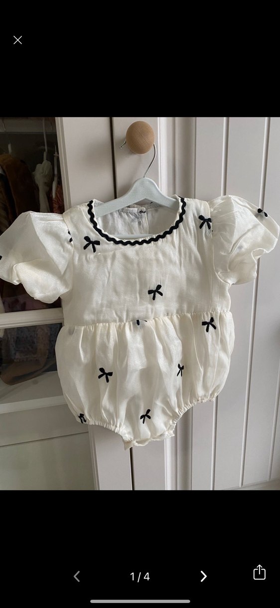 Nakışlı siyah fiyonklar ve fırfır detaylı beyaz bebek tulumu. Pastel tonlarıyla yumuşak bir görünüm sunar. Bir kez kullandım 3-6 ay