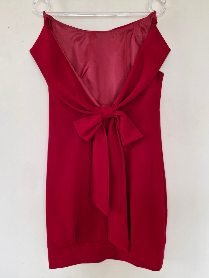 Bordo renkli ve sırtında fiyonk detaylı drapeli midi abiye elbise. Milla'nın ilk ürünlerinden, kumaşı çok kaliteli ve ütü istemiyor. Beden degişimi nedeniyle sadece 2 kez giyildi.