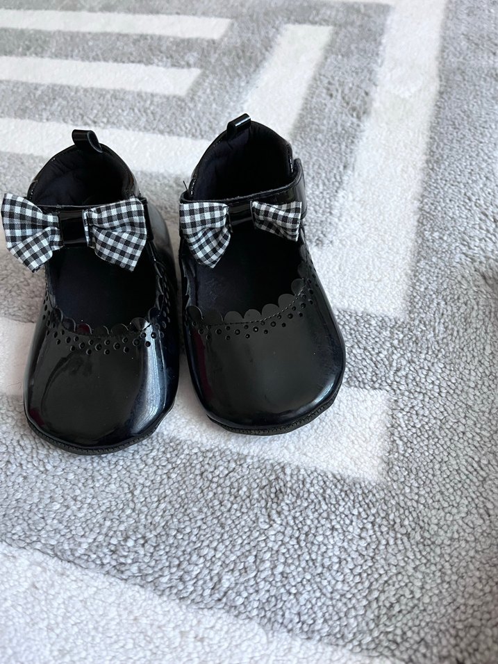 Lastik malzemeden yapılmış, siyah renkli ve kareli fiyonk detaylı kız çocuk babet ayakkabısı, gotik tarzda ve klasik şıklıkta.