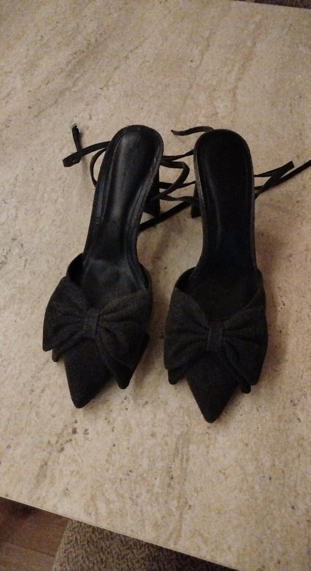 Fiyonklu ve bağcıklı siyah stiletto topuklu ayakkabılar, gotik ve Paris tarzını birleştirir, romantik akşamlar için şık bir seçimdir.