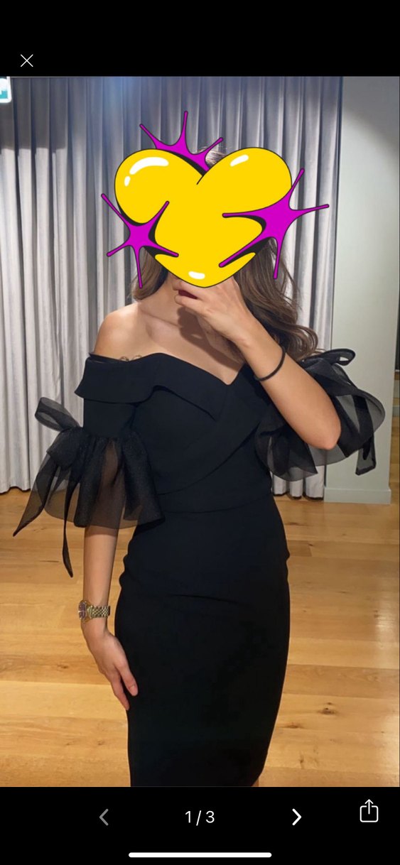 Fiyonklu, straplez yakalı ve askılı kollu siyah midi elbise, hiç bir Defosu yoktur. L bedendir