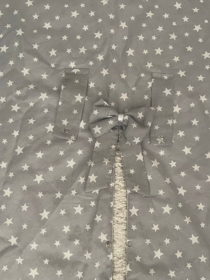 Gri renkli, nakışlı yıldız desenli, fiyonklu puset örtüsü sağlam durumda